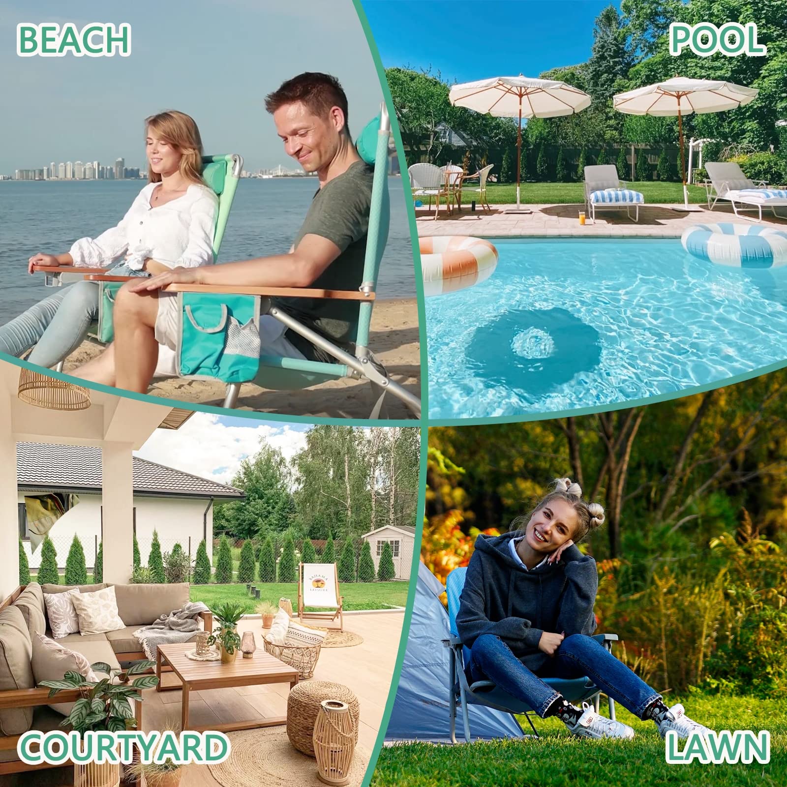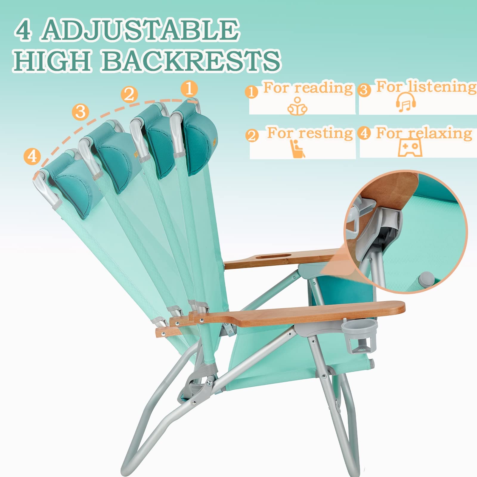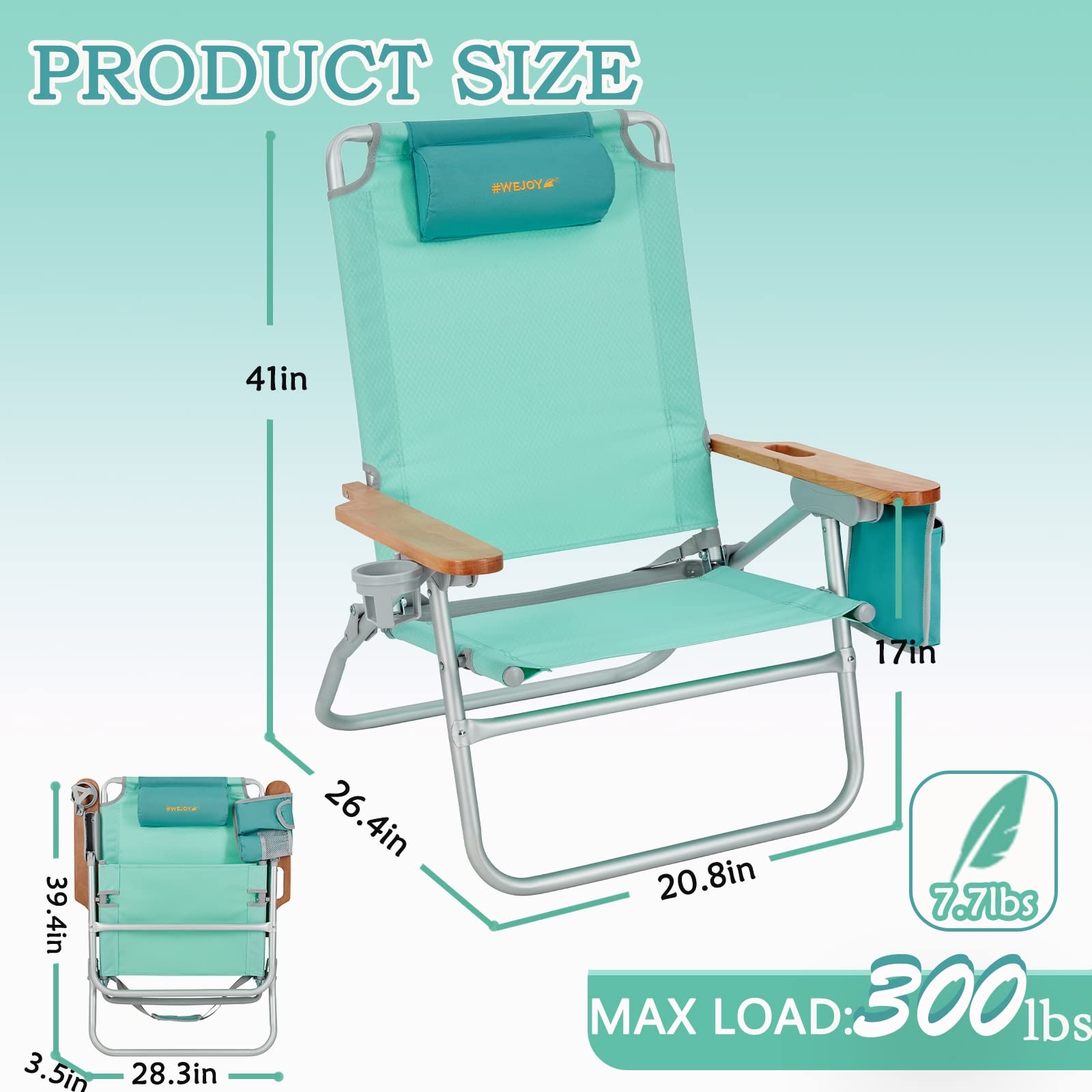 The WEJOY Lightweight Portable Folding Beach Chair is designed with flexibility and comfort in mind. Its four-position adjustable armrest and cotton-filled pillow provide a custom fit and support. Durable beech wood armrests won't heat up in hot weather, while aluminum alloy brackets offer corrosion resistance. Plus, you can stay hydrated with a cup holder and concealed hard cup holder. Enjoy outdoor relaxation in comfort and convenience!