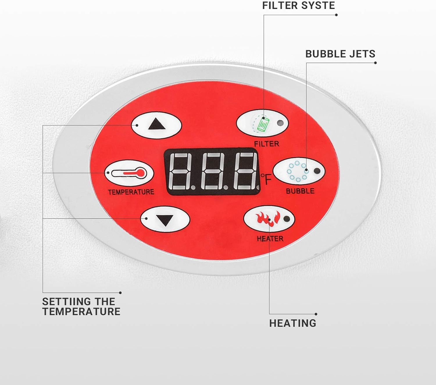 - Effortless Control with Digital Panel: Adjust water temperature (up to 104°F) and jet flow without leaving the tub, thanks to the user-friendly digital control panel. Utilize the power-saving timer to preset spa temperature up to 24 hours in advance. Please note: For temperatures below 32°F, the spa should not be used.