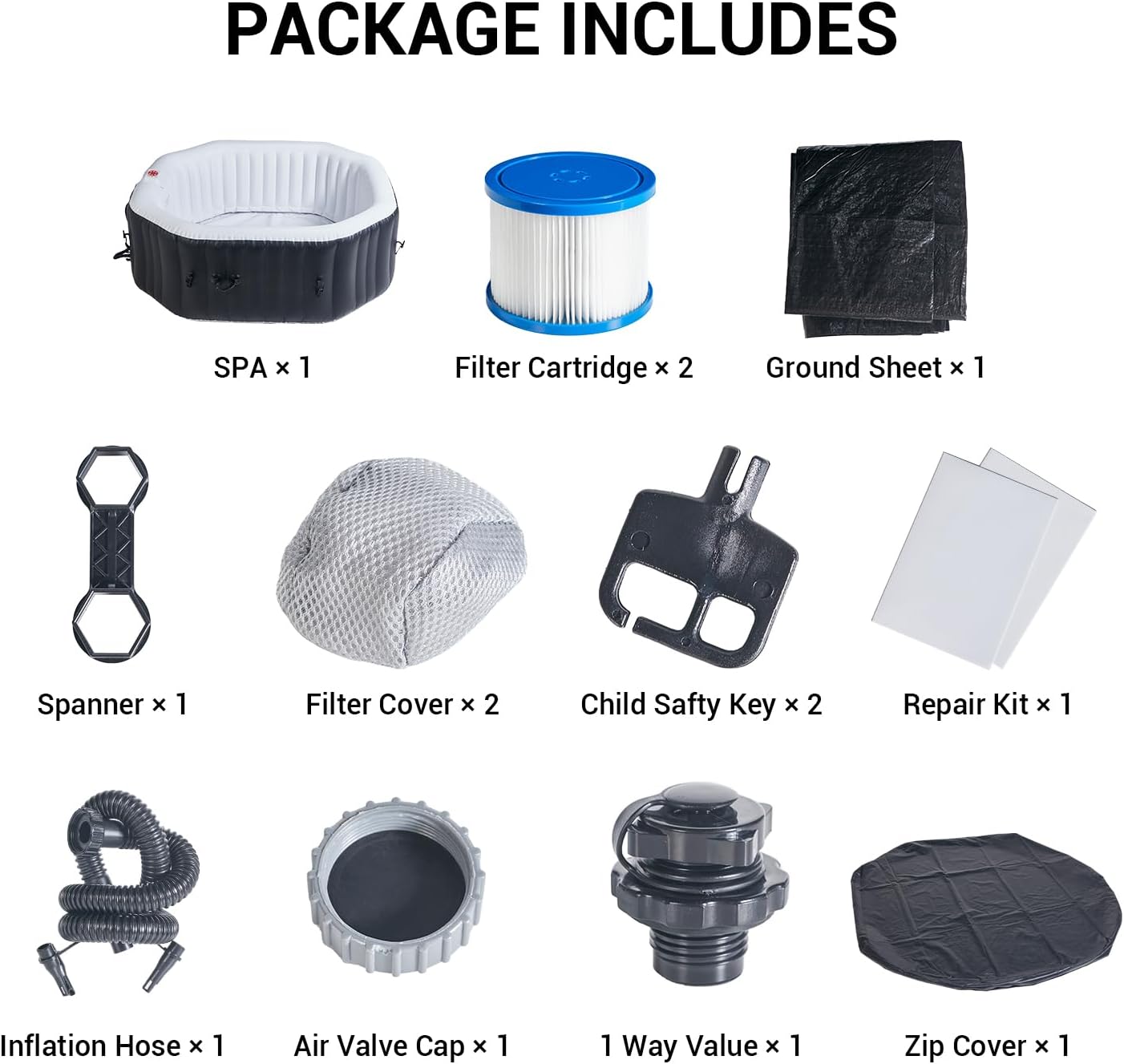 - Ideal for 4-5 People: With a water capacity of 910L/240Gal and a maximum load of 210KG/462LB, this spa comfortably accommodates 4-5 individuals. The puncture-resistant tri-tech material and I-beam construction ensure structural integrity, even when people sit on the side walls. Ensure water levels stay between the marked maximum and minimum lines for optimal heating.